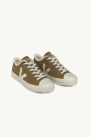Pair of low-top sneakers with suede upper, beige color, screen-printed logo. Insole in Amazon rubber, recycled E.V.A., fleece. Amazon rubber outsole, mineral silica. Fleece lining with recycled polyester. Organic cotton laces.