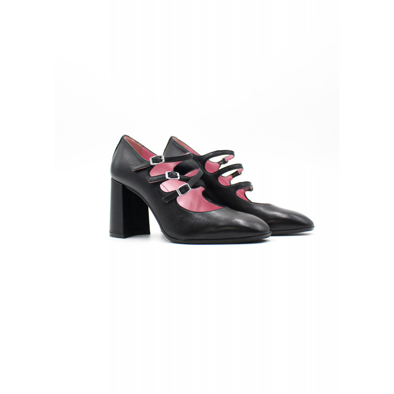 Keel Babies model by Carel, matte black, 8.5 cm heel, three straps, pink interior, retro style.
