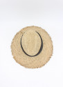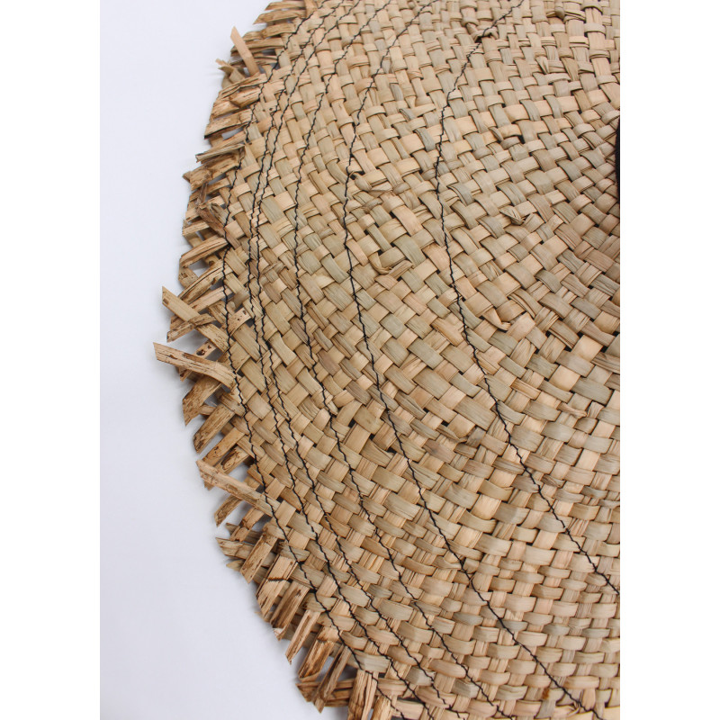 Ibrigu hat, beige plaited straw, black fabric around the top of the hat, natural.
