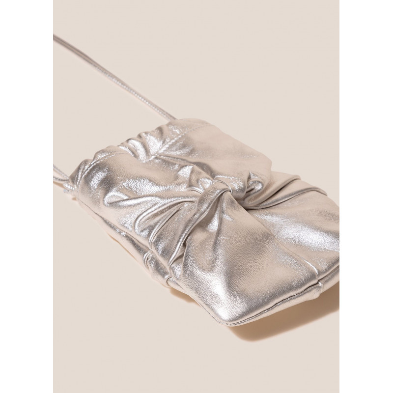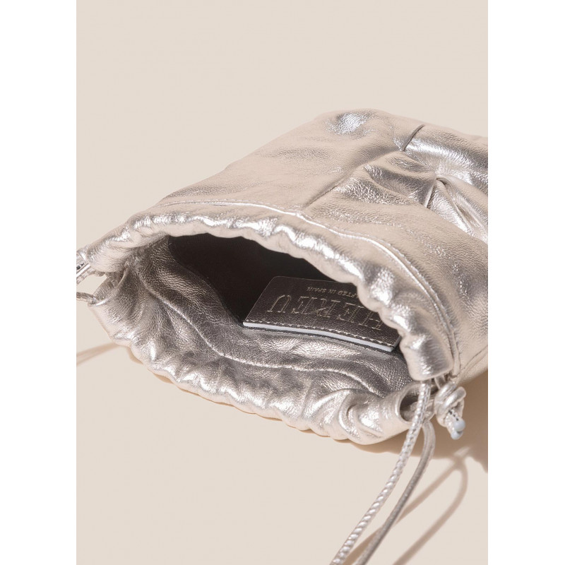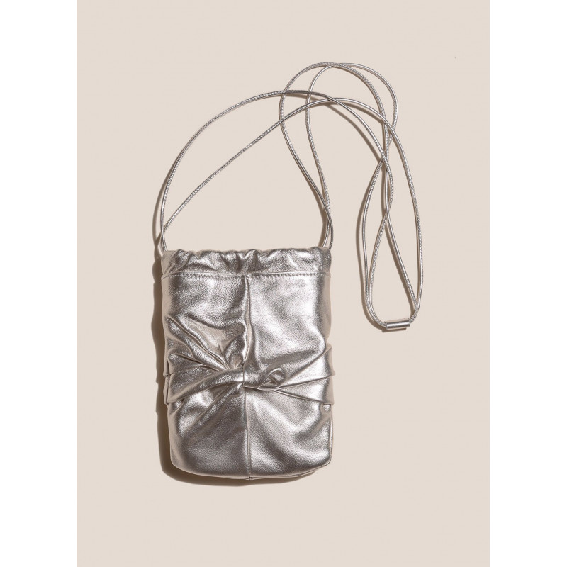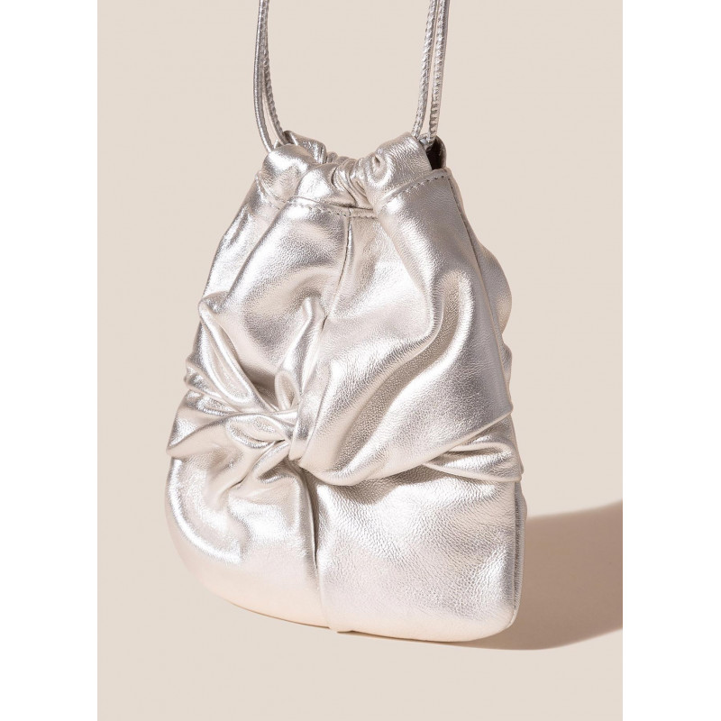 Silver Hereu Ronet Mini Metallic flat bag, shoulder strap with twisted details at the front, made of soft Italian lambskin, lined with organic cotton canvas. Drawstring closure. Unique exceptional piece handmade in Spain.