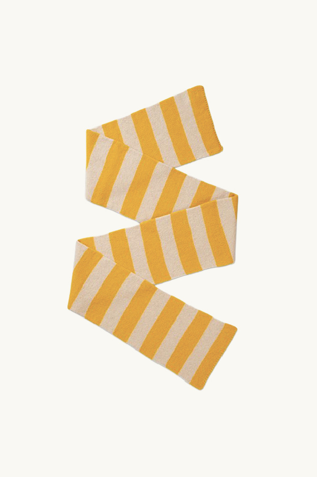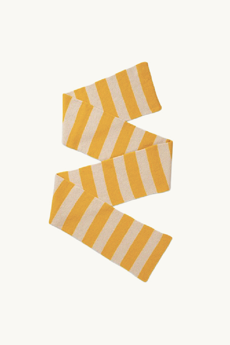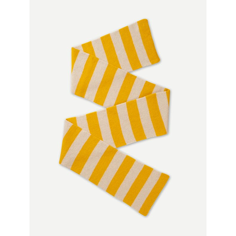 Large, striped golden eye and oatmeal scarf by Jo Gordon, luxurious and cozy, extra-soft brushed lambswool. Made in southwest Scotland using traditional techniques and hand finishing.