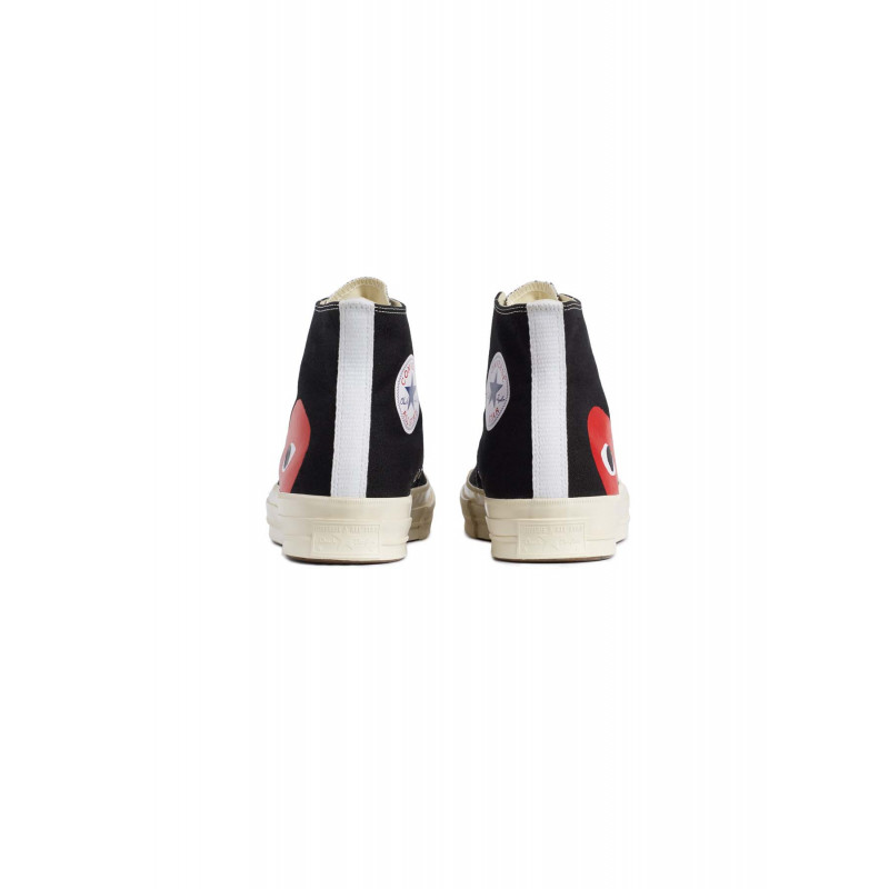 Converse Chuck Taylor x CDG white low shoes, red logo patch heart pattern on the side, two inner side eyelets, round toe, lace-up closure, rubber sole.