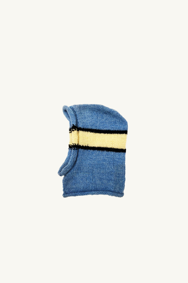 Made in a blend of Wool and Mohair, this Sublime hood combines Blue/Off White/Black fibers hand-knitted in Nepal.