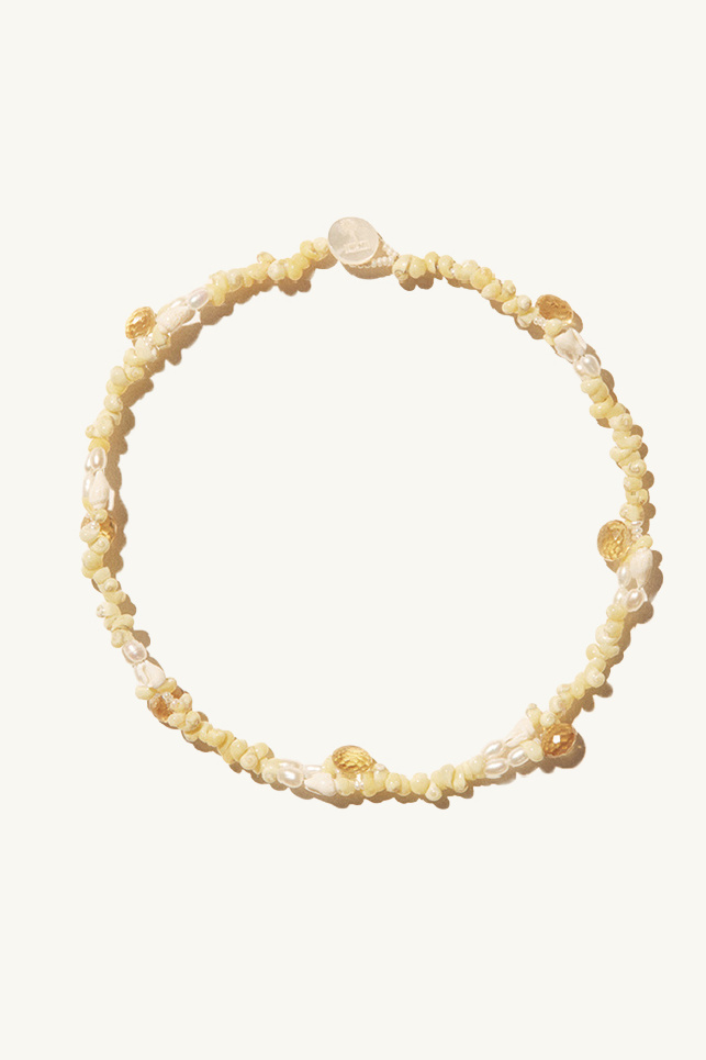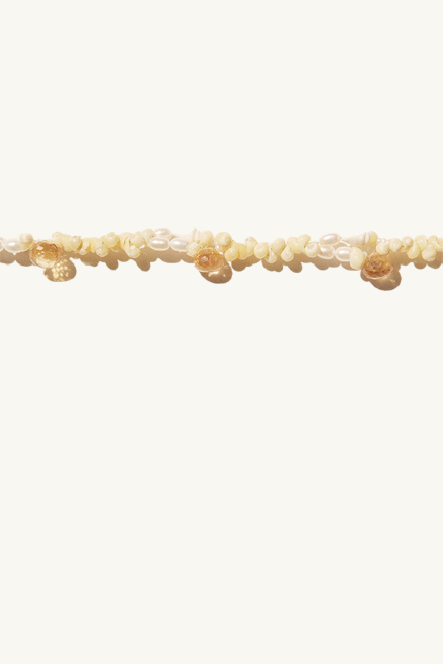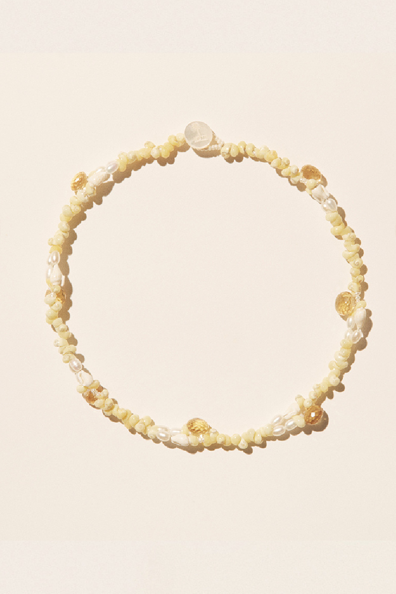 Nata choker necklace made if citrine, shells, baroque pearls and rockstones from the brand Pascale Monvoisin. Mother-of-pearl button stamped with the signature PM.