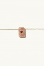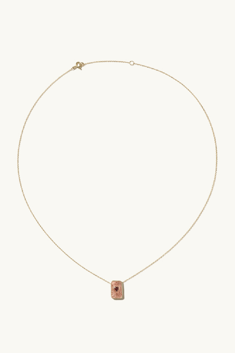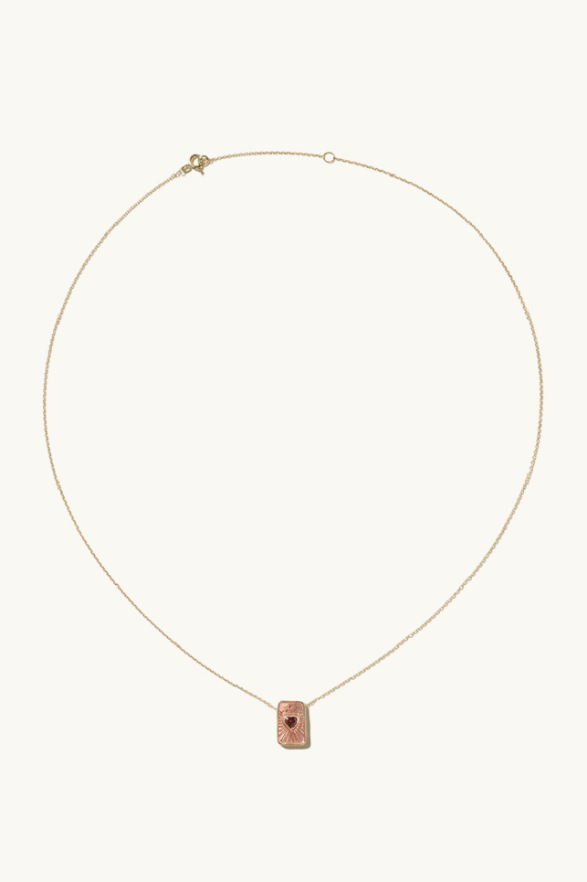 Inspired by talismans, this piece reveals a delicate gold rectangular pendant adorned with pink resin, at the center of which lies a heart-shaped garnet stone, finely surrounded by engraved details. The reverse, fully gilded, is pierced with a heart revealing the stone beneath.