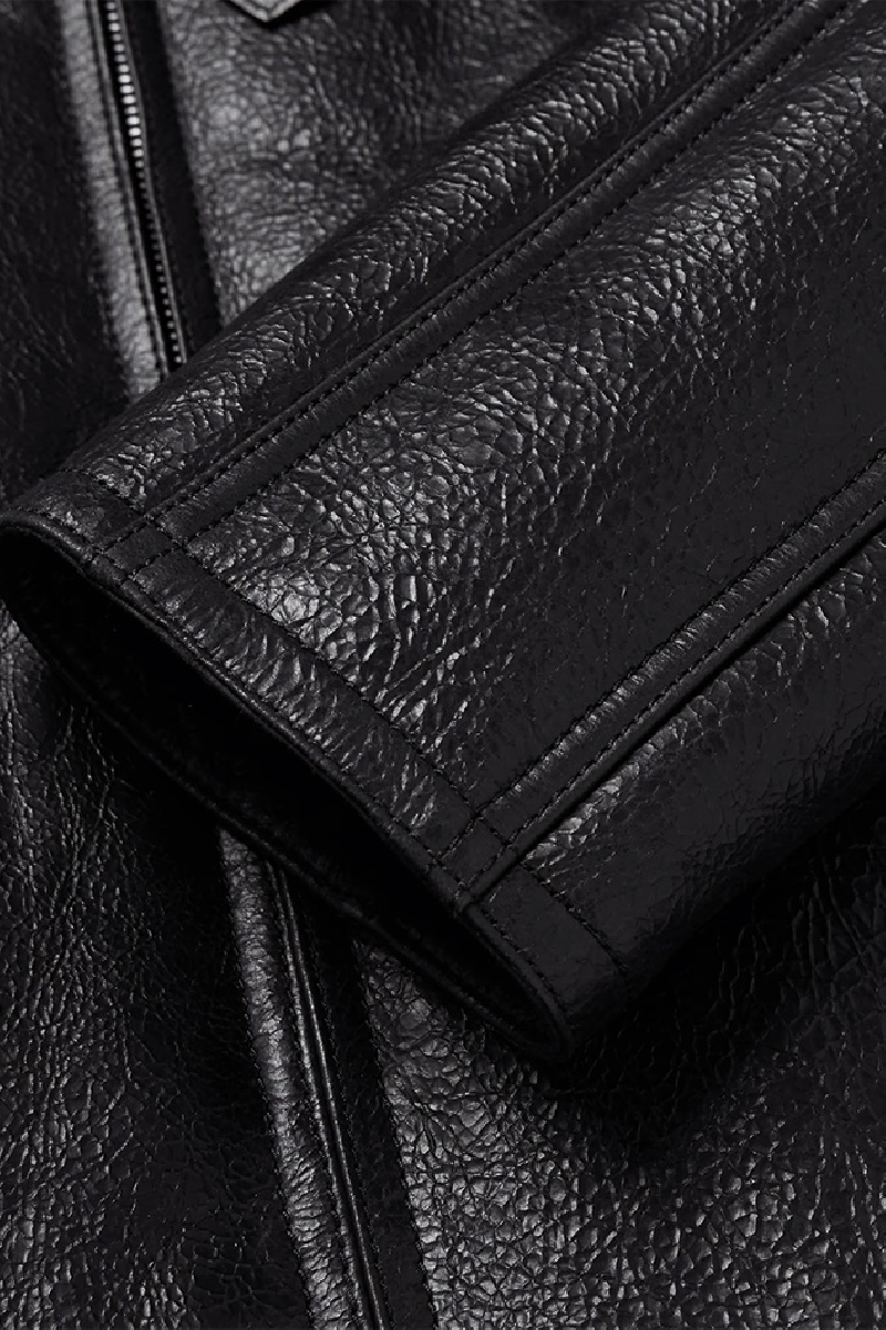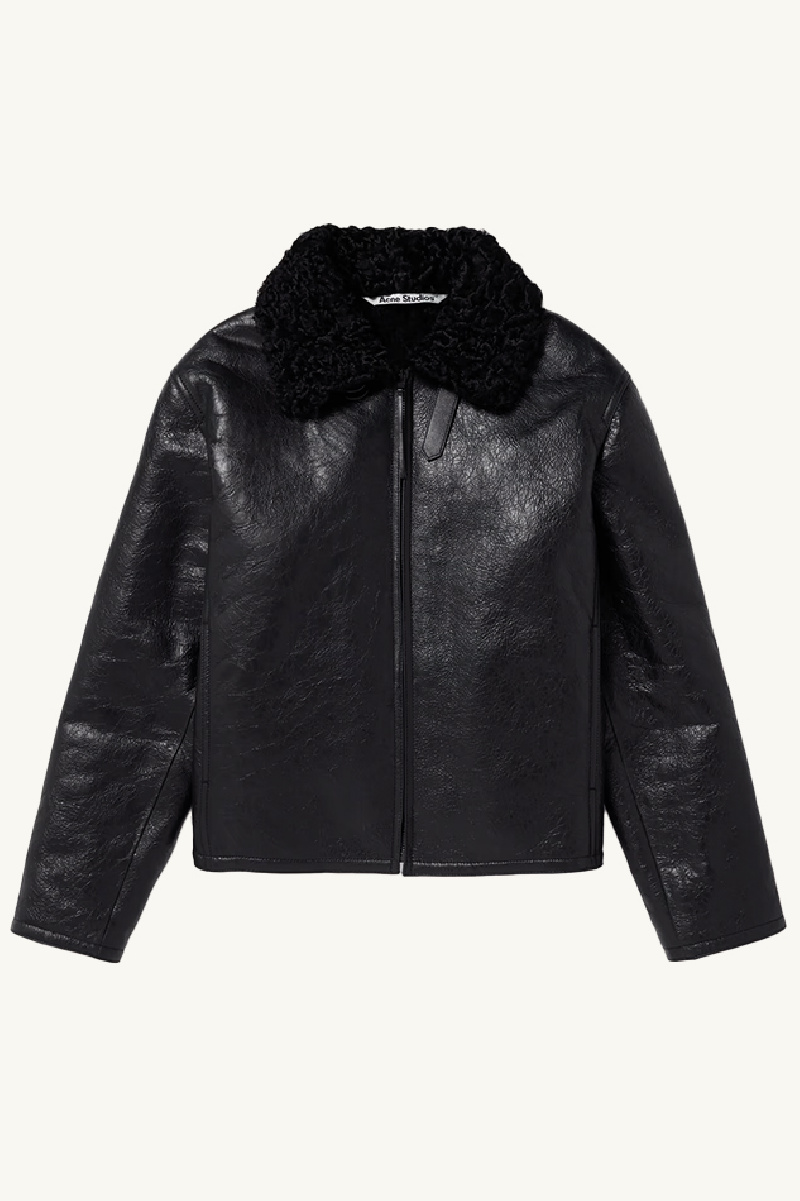 The black leather jacket from Acne Studios is made from lambskin, with a waist length, low armholes, a wool fold-over collar, a zip fastening with a tie, two pockets on each side and a lambswool lining, brand inscription at top of black spine.
