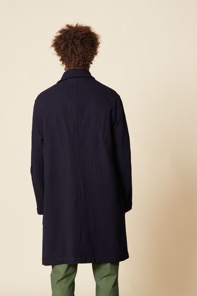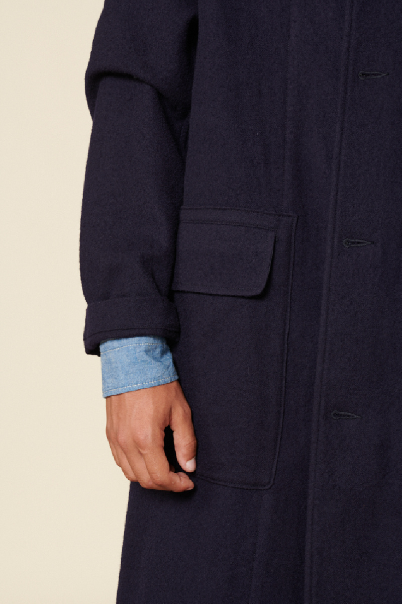 The navy blue Tumbler coat from Sage de Cret features an elegant straight fit, a refined shirt collar and a button fastening. It has a side pocket with piping, another with a flap, and an inside pocket for a discreet touch of practicality.