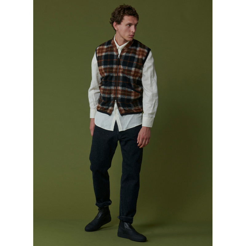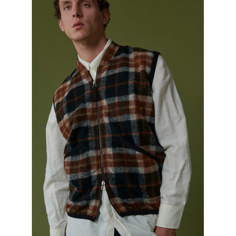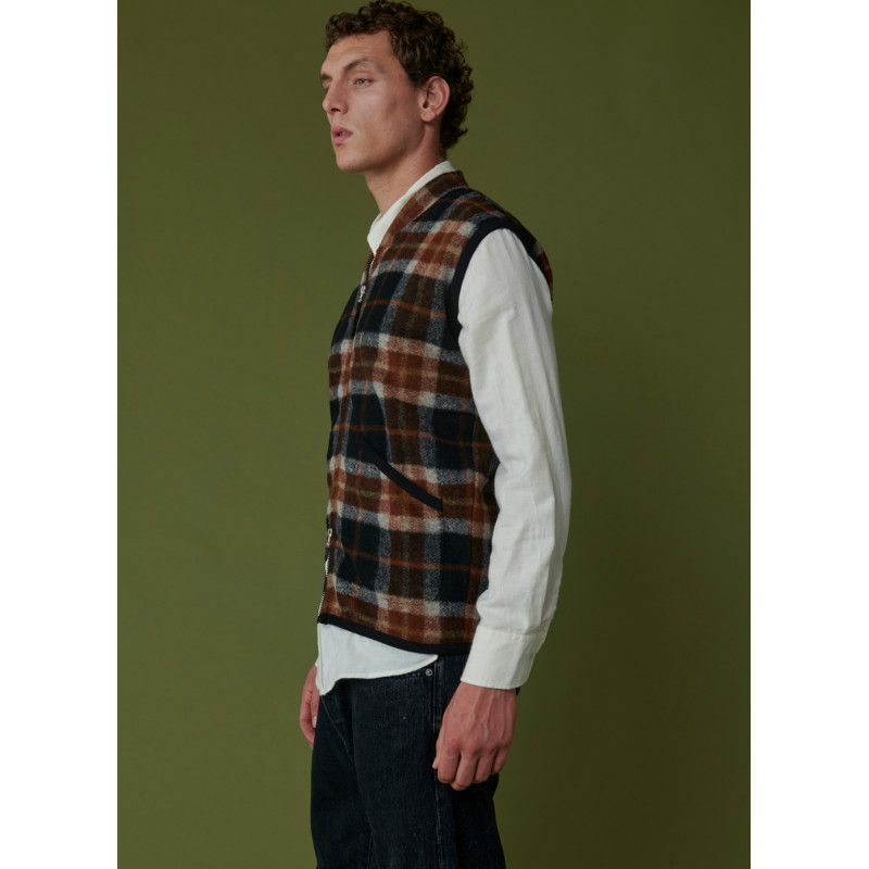 Universal Works sleeveless vest, high collar, zip closure, patch pockets on the sides with black fabric detail, black checked pattern.