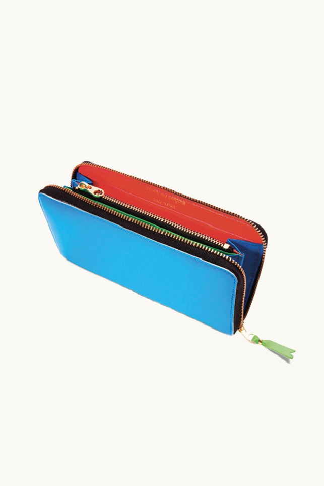 Comme Des Garçons brand wallet crafted from smooth blue calf leather.