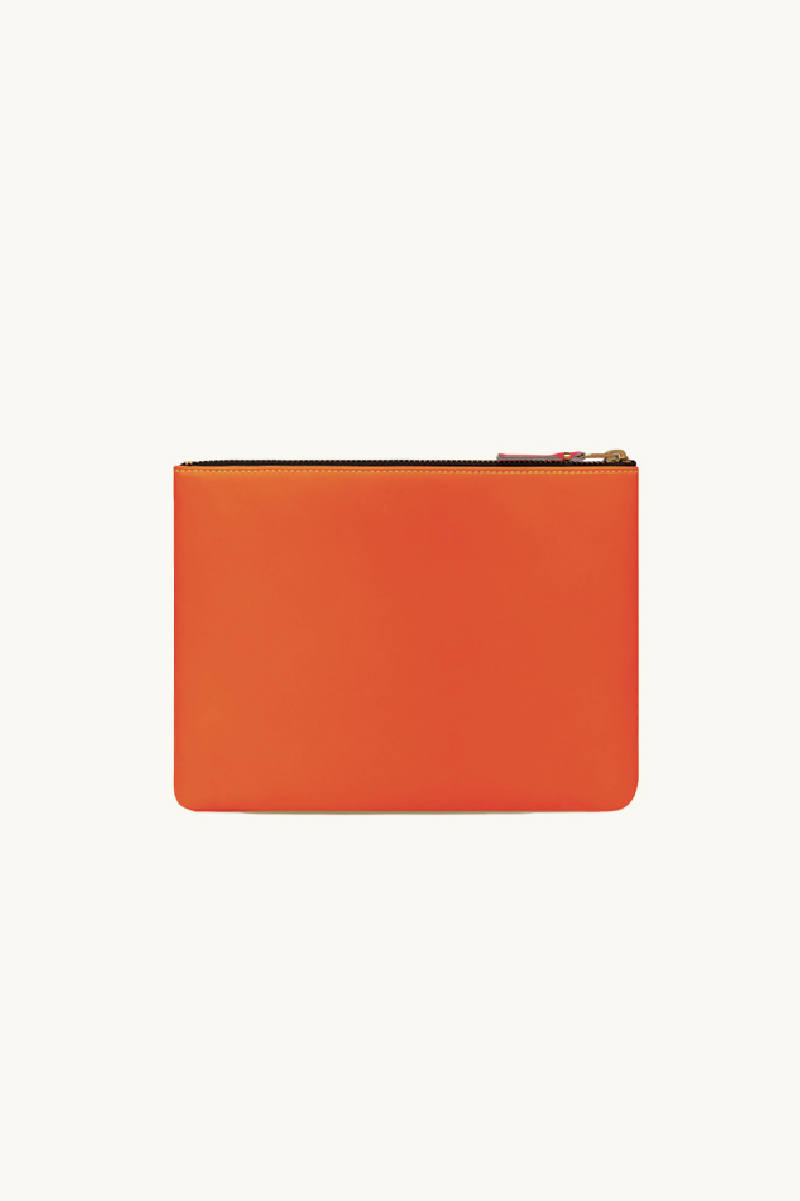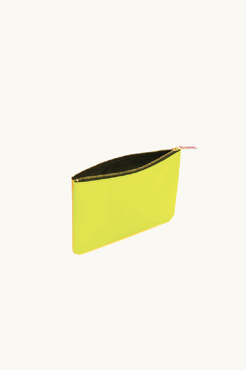 Comme des Garçons large zipped pouch in goatskin leather, neon yellow on one side and neon orange on the other, with Comme des Garçons signature gold lettering.