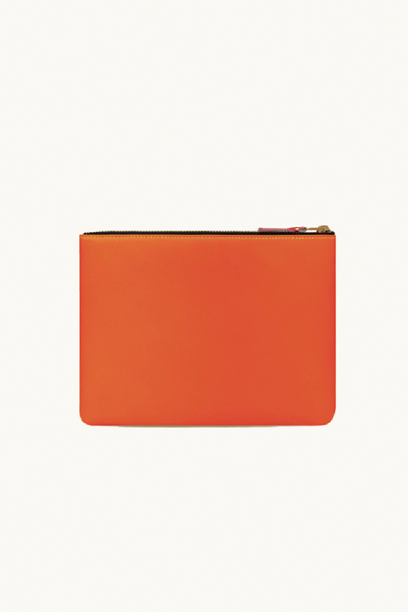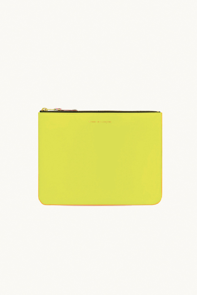 Comme des Garçons clutch bag made from smooth goat leather in fluorescent yellow and orange.