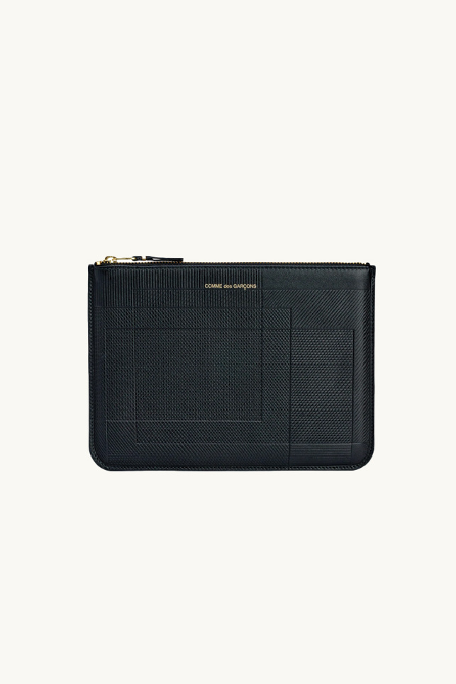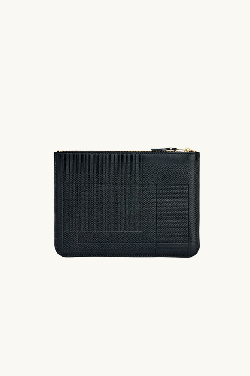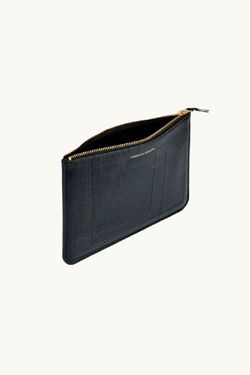 Comme Des Garçons large coin purse/pocket, black, in cowhide leather, with tone-on-tone embossed lines.