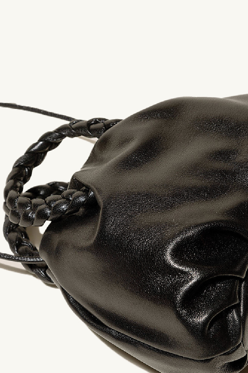 An enlarged version of the iconic BOMBON model, it features a pleated design, braided handles, a thin adjustable shoulder strap, and a magnetic closure at the top.