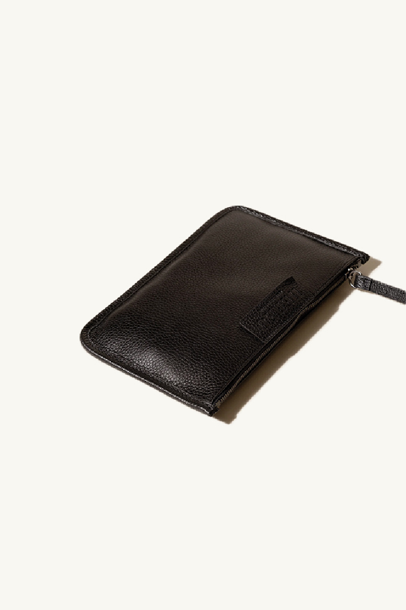 It features a square shape and medium size, a tie closure at the top, and an interior zippered pocket.