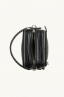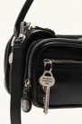 It features a structured rectangular design and offers multiple zippered compartments, a key charm, as well as a handle and an adjustable strap.