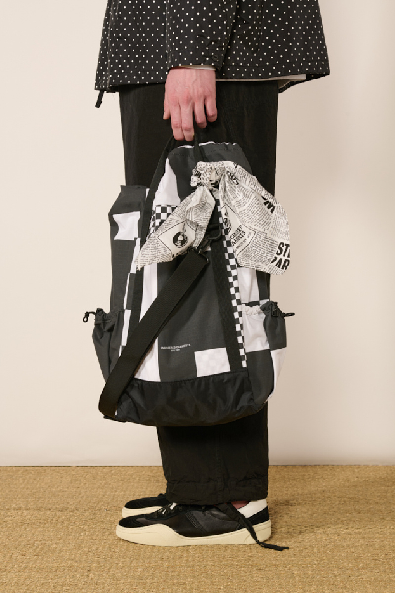 It offers a spacious interior, including an internal zip pocket, an external zip pocket, and two side pockets with drawstring closures. The bag closes with a top drawstring, combining practicality and style.