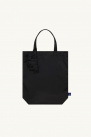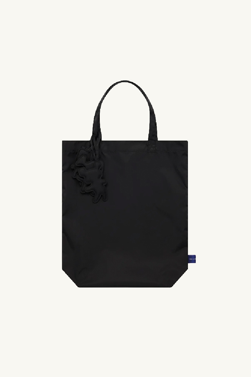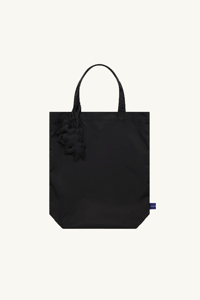 It offers a minimalist and monochrome design, with a main compartment, handles with charms, and a brand label on the bottom.