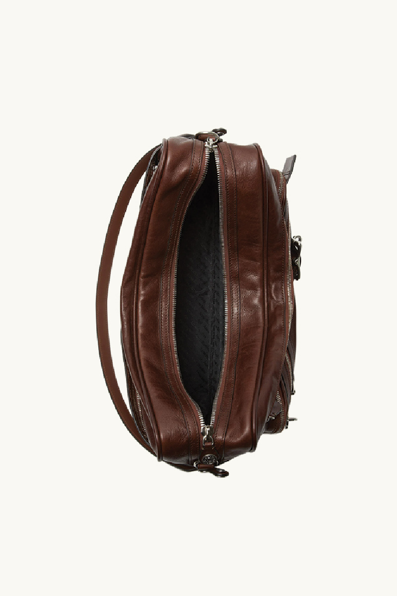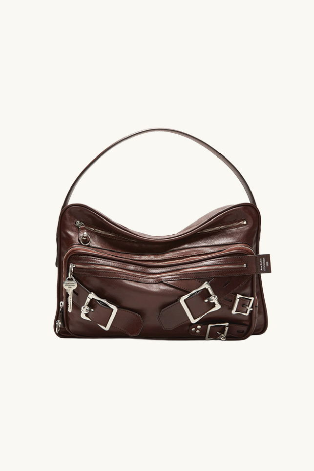 It features a multi-pocket design offering generous storage space, along with large interlaced buckles, a key detail from the new collection.