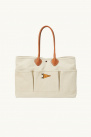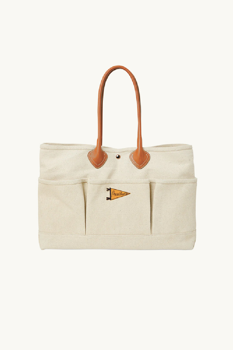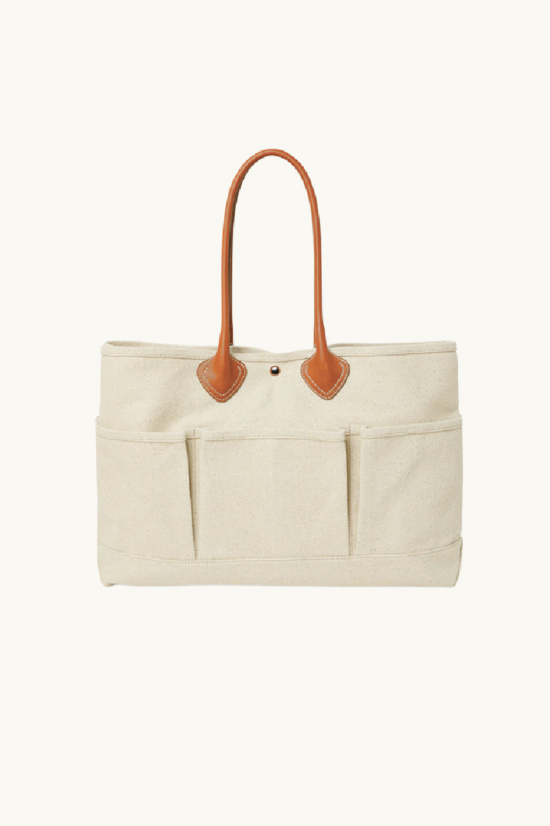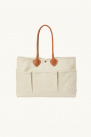 The model is completed with six external pockets placed all around the bag, providing additional storage space. It comes with large camel handles and a centrally positioned logo.