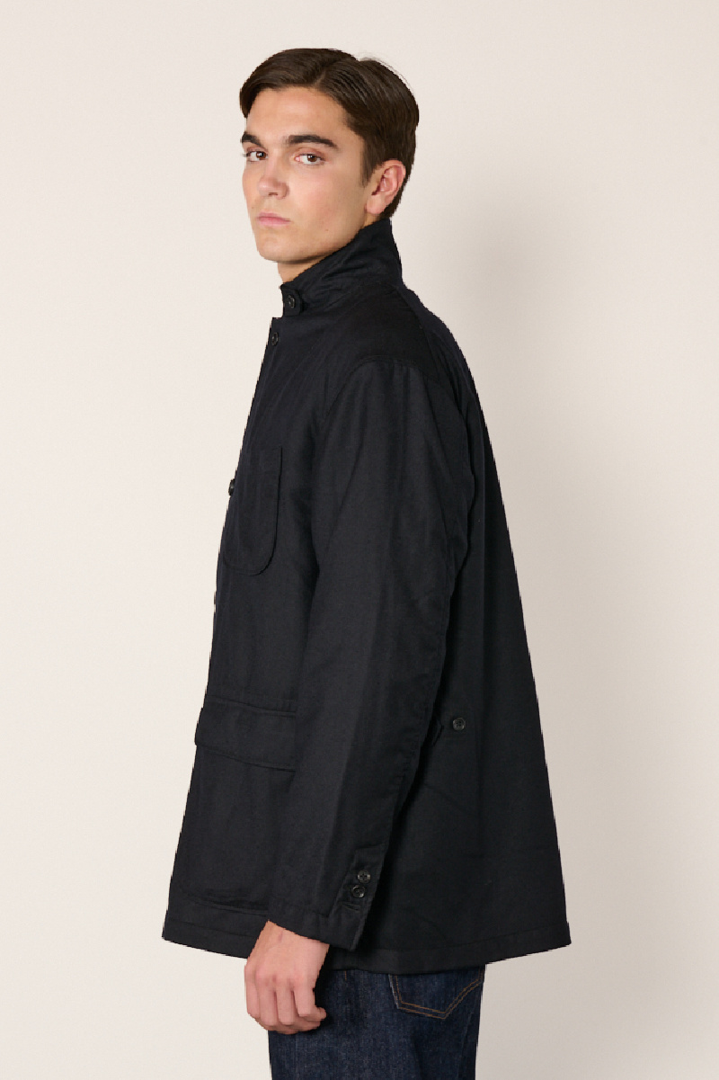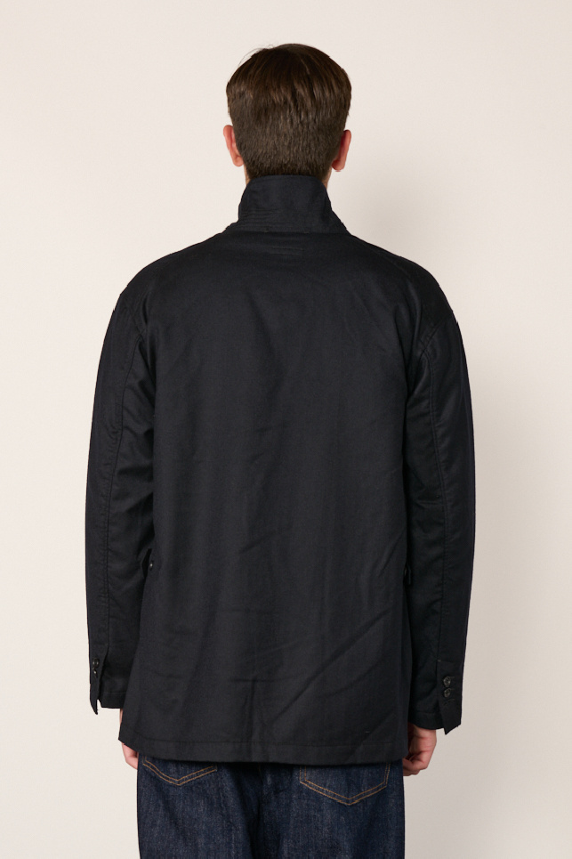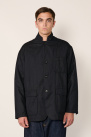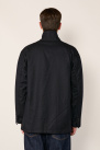 It offers a relaxed fit with a shirt-like structure and feel, and features details such as a high collar and back button plackets.