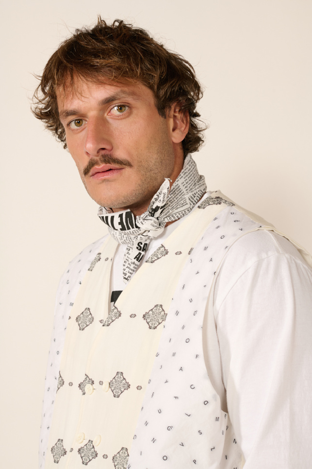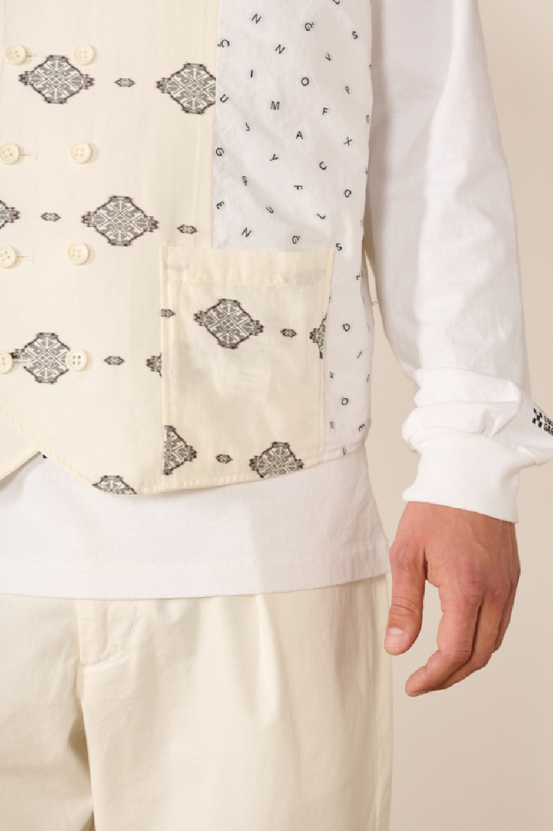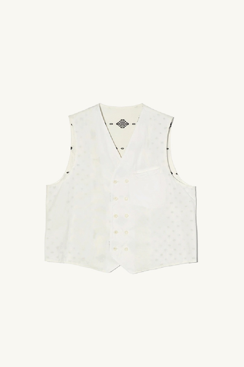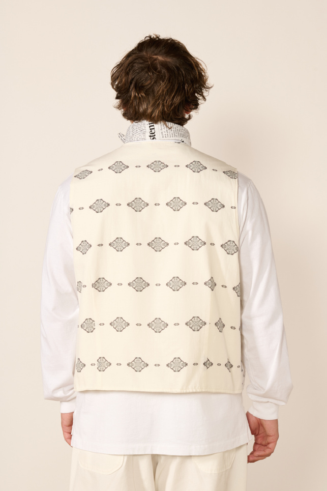 Reversible sleeveless vest made of thick white cotton poplin, from the brand Engineered Garments.
