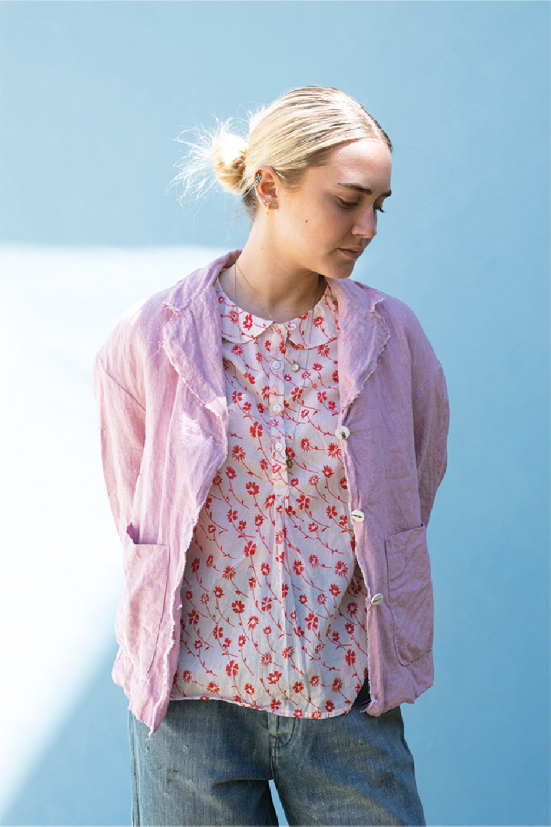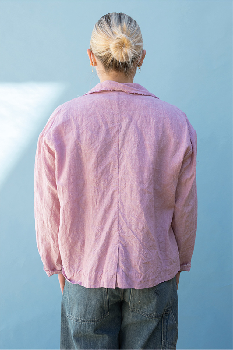 Buig Stan, Sula linen jacket in lilac, classic cut, white buttons for fastening, V-neck, long sleeves, patch pockets, crumpled effect, slit at lower back, frayed seam detail at ends.