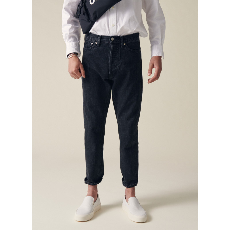 Ordinary Fits mid-rise washed black jeans, straight fit, five pockets, button closure under placket, straight hem, leather label on back.