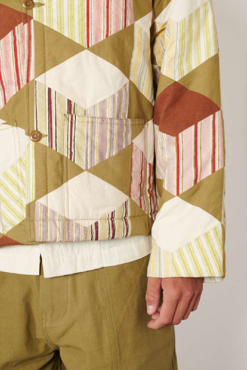 Iconic of the brand, the S.O.T. jacket offers a boxy cut adorned with hand-embroidered “Story msg.” chain-stitch, a buttoned front and two patch pockets.