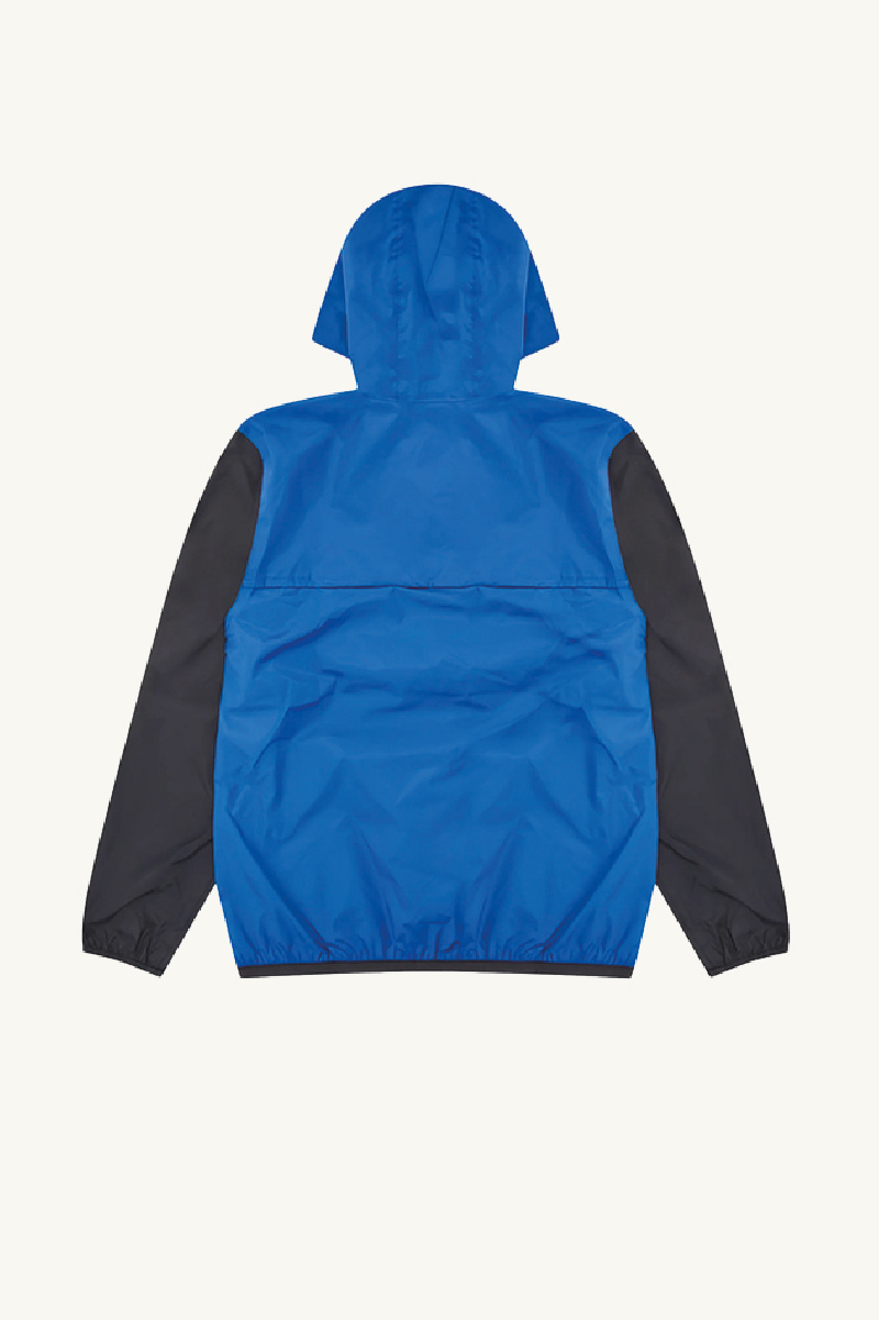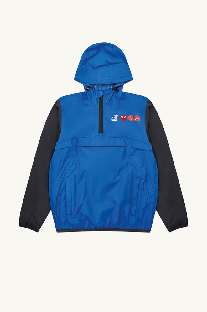 K-WAY X Comme des Garçons PLAY collection, two-tone black and blue, CDG Play and Kway logo on the chest, straight cut, half-zip, elastic drawstrings at the bottom and on the hood, zipped pocket for pac-away storage.