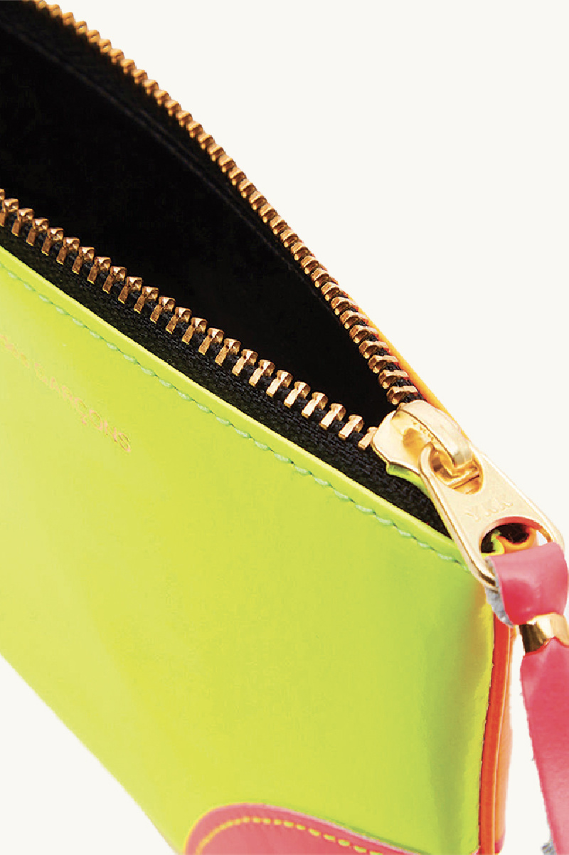 Comme Des Garçons wallet, super fluo, yellow/orange, smooth leather, quality finish, zip fastening, brand logo engraved in gold leaf on front.