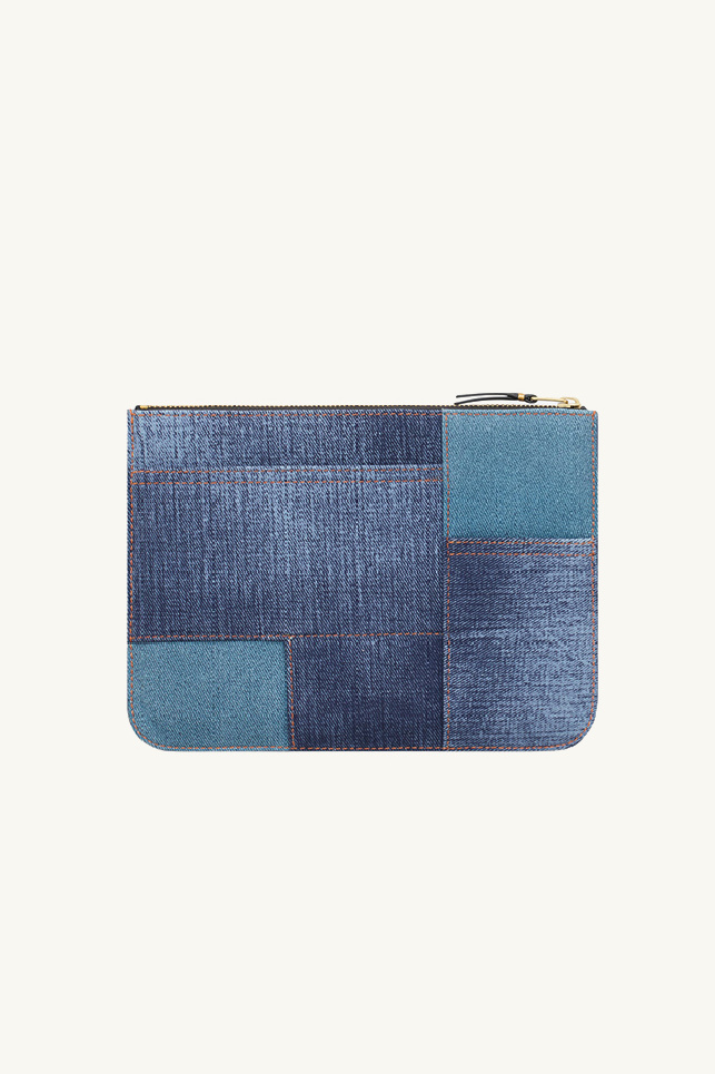 Pouch by Comme des Garçons made from lambskin leather decorated with a trompe l'oeil denim patchwork pattern.