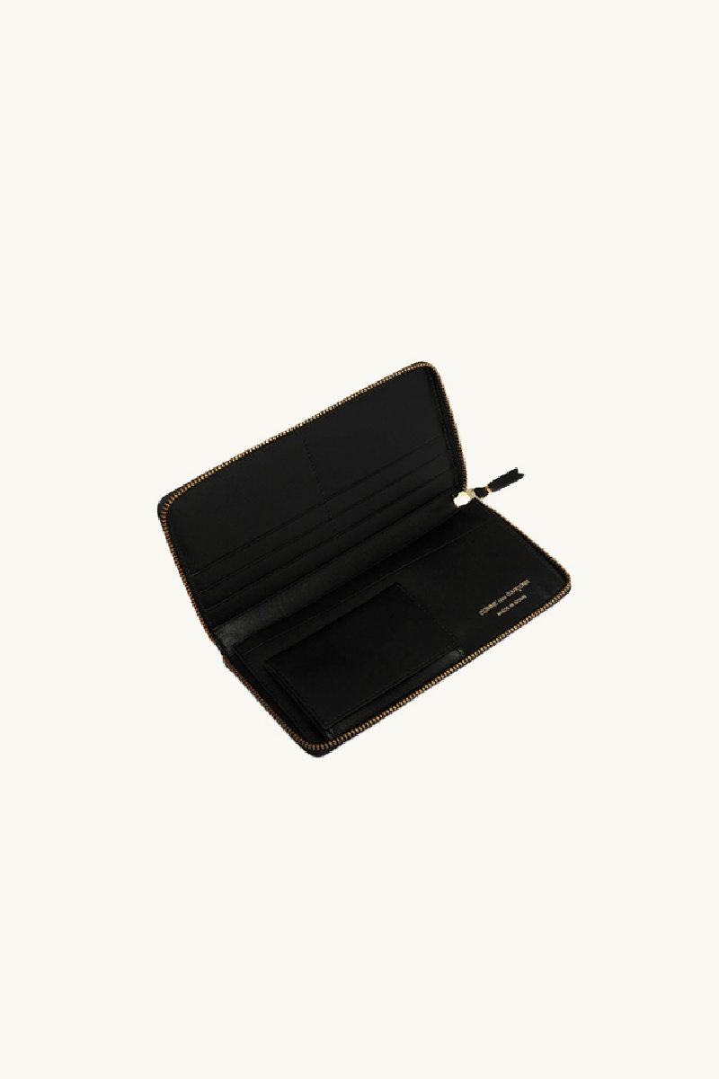 Black calf leather Comme des Garçons wallet. Zippered closure, six-notch card compartment and coin storage with button closure.
