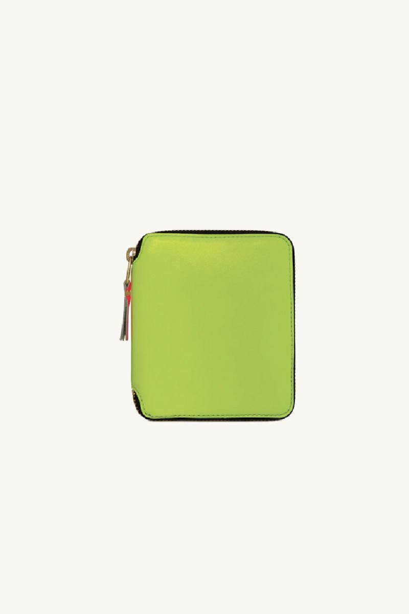 Comme des Garçons wallet, cowhide leather, fluorescent colors: yellow exterior, orange and pink interior, zipper closure, four notches card compartment and coin storage with button closure.
