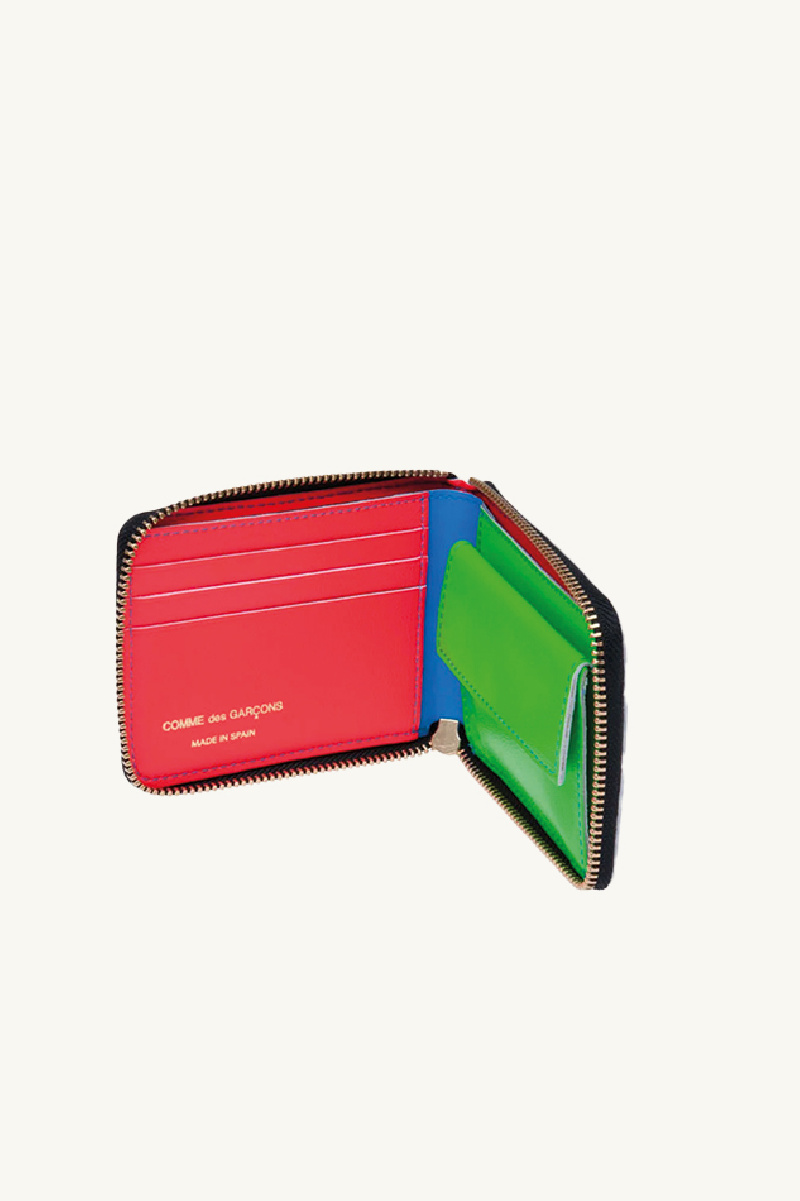 Comme des Garçons wallet, cowhide leather, fluorescent colors: blue exterior, pink and green interior, zippered closure, four-notch card holder compartment and coin storage with button closure.