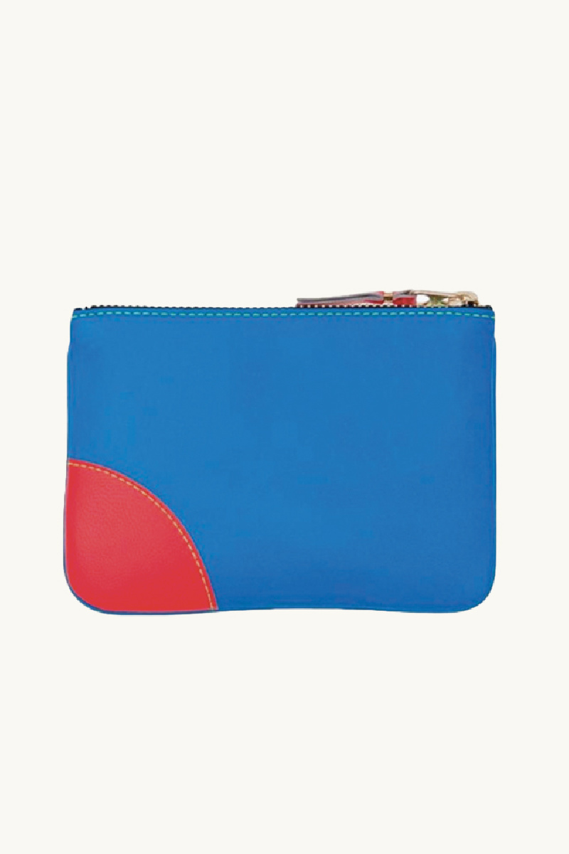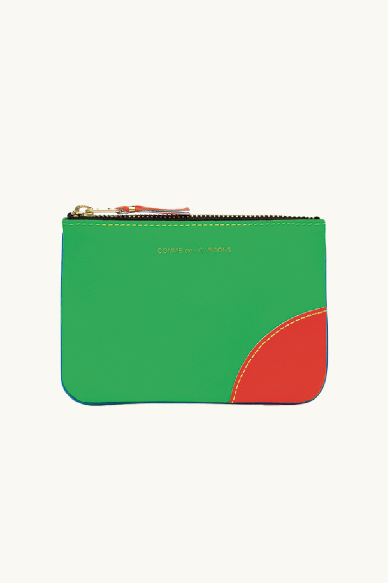 Comme Des Garçons wallet, super fluo, green/blue, smooth leather, quality finish, zip fastening, brand logo engraved in gold leaf on front.