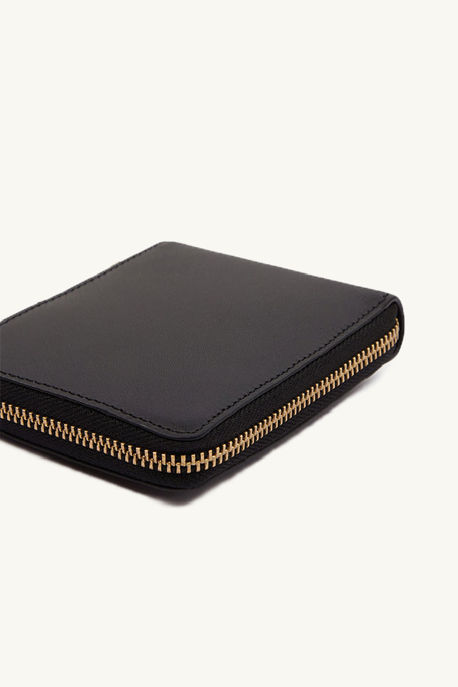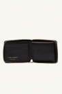 Zip closure, silver leather interior with gold embossed logo, compartment for notes, 3 card slots, coin pocket with press stud closure.