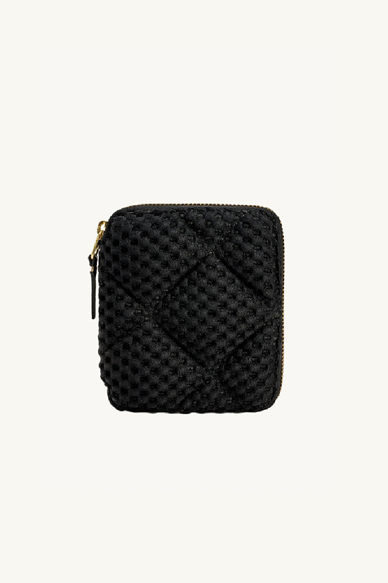 Large black wallet from Comme des Garçons, quilted in honeycomb, lined in cowhide.