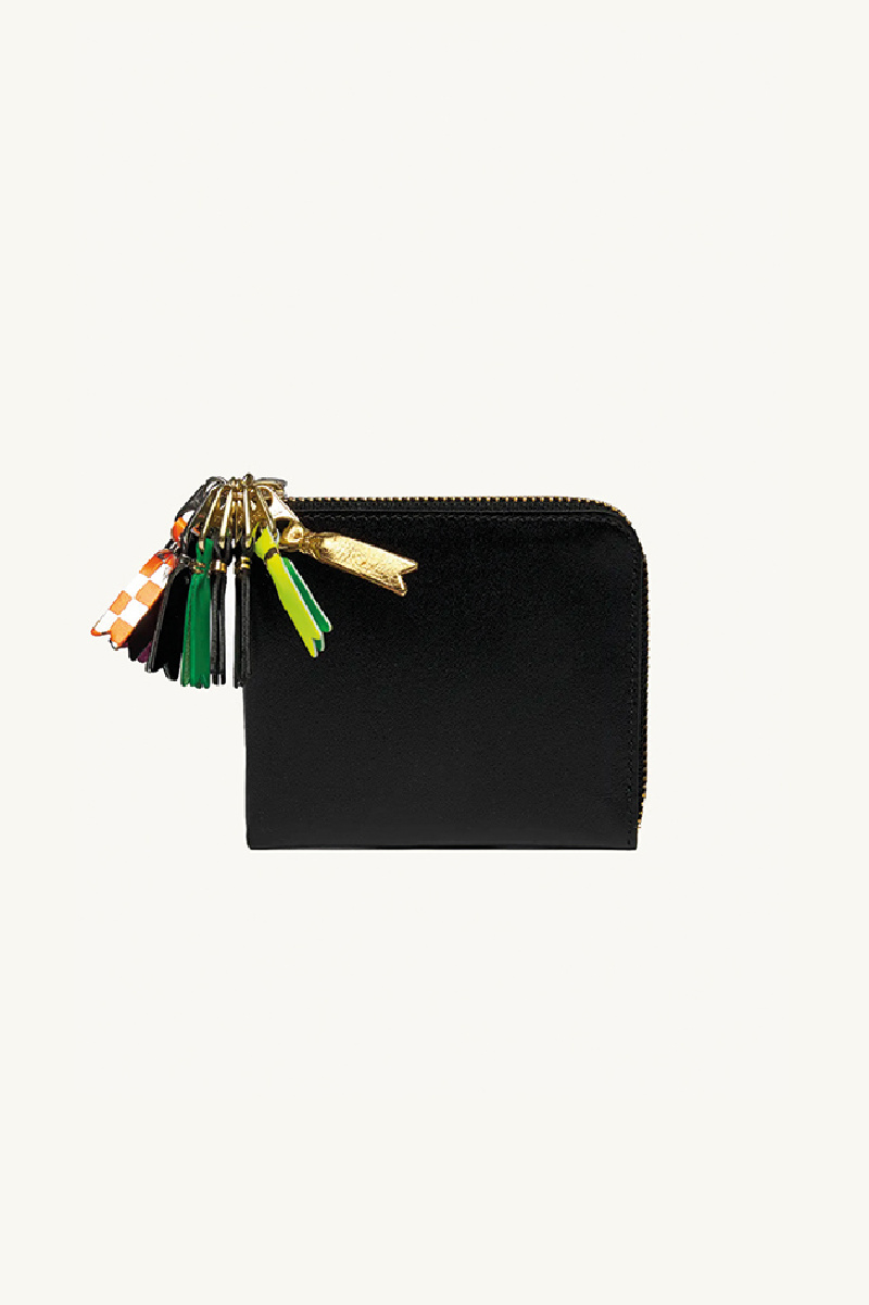 Small Medley wallet by Comme des Garçons, black, made of cowhide leather with coloured leather pompoms.