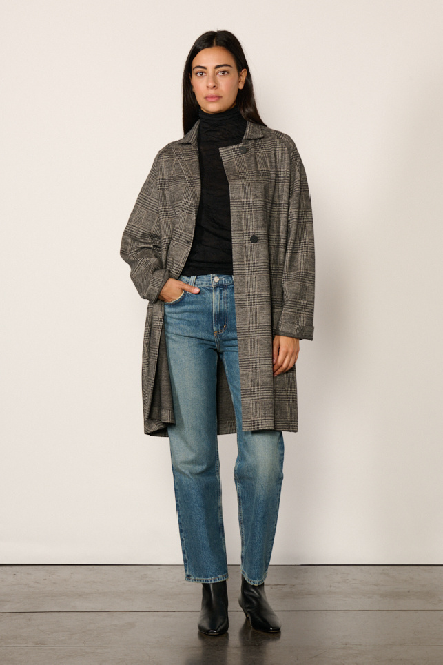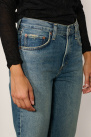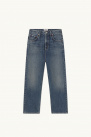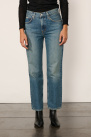 Featuring a mid-rise, straight-leg silhouette with a slightly cropped length, this piece is elevated by a vintage-inspired wash and subtle frayed details along the pockets and hem.