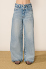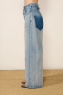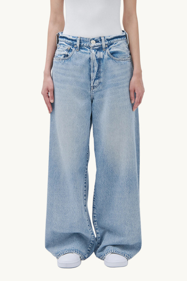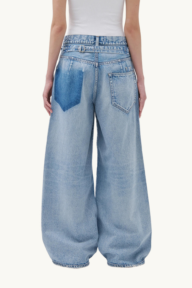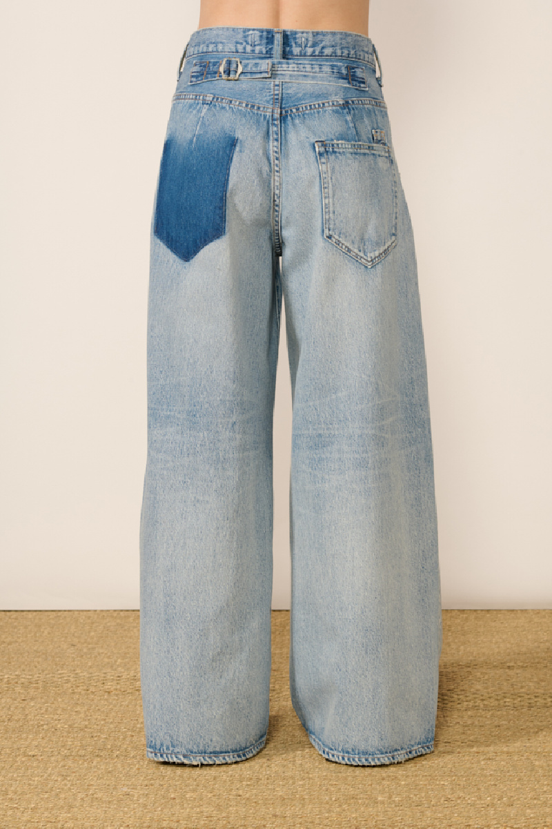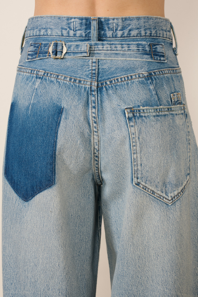 Inspired by vintage styles, the jeans showcase a faded blue wash and a deliberately deconstructed contrasting back pocket.