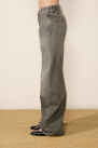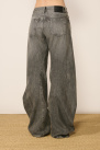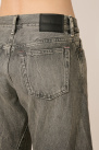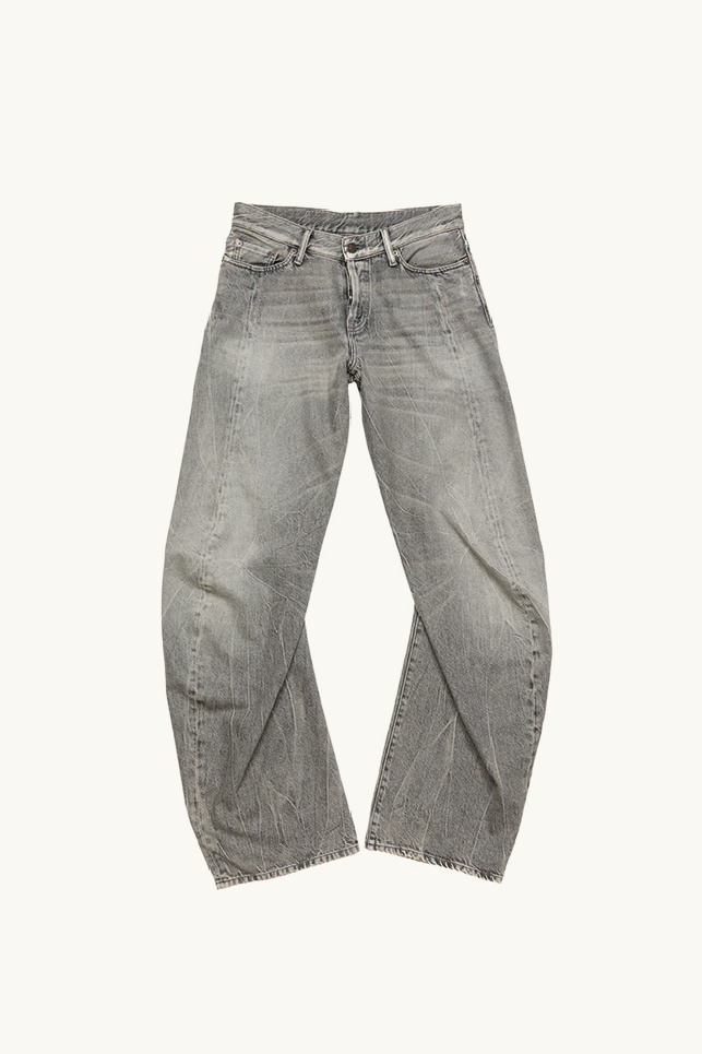 They feature a loose fit with a low-rise waist and twisted seams that create a subtly curved leg effect. Finished with a button fly, five-pocket construction, and a black leather jacron patch.