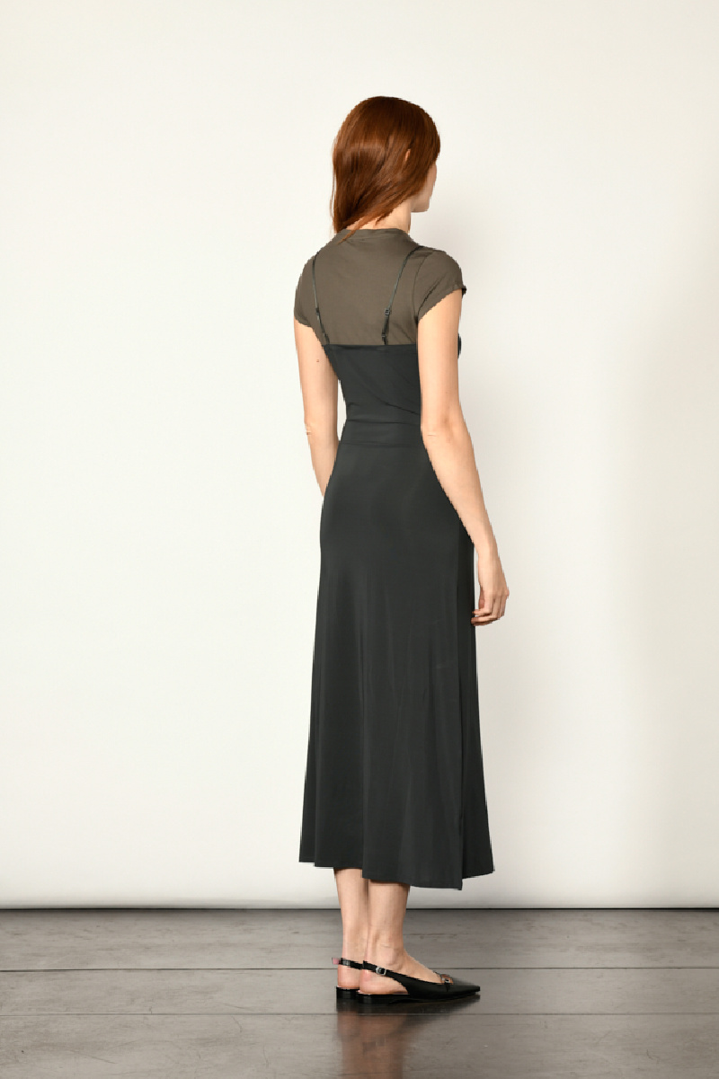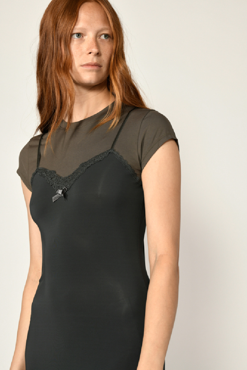 This dress revisits the layering spirit with a two-stage construction: an organic cotton t-shirt integrated under a dress with thin straps, sublimated by a delicate bow on the shoulder. Made in fluid jersey, it has a straight cut and a mid-calf length, combining comfort with a contemporary look.