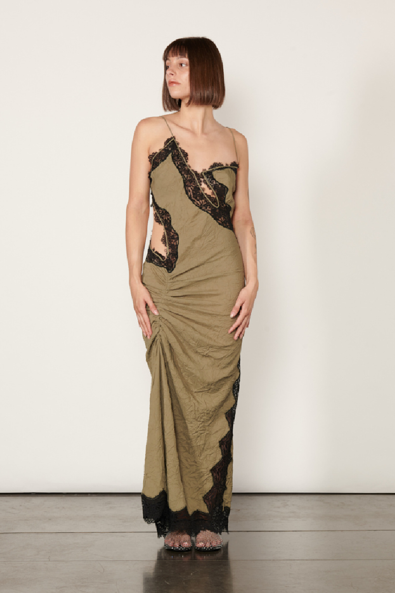 Crimped dress, a play of textures and transparency takes hold in this striking midi dress, where crumpled crepe meets the delicacy of openwork lace in eucalyptus and black, from the Christopher Esber brand.