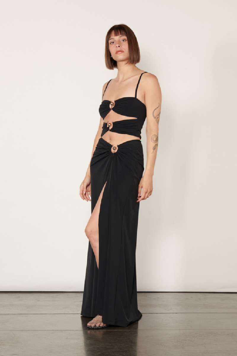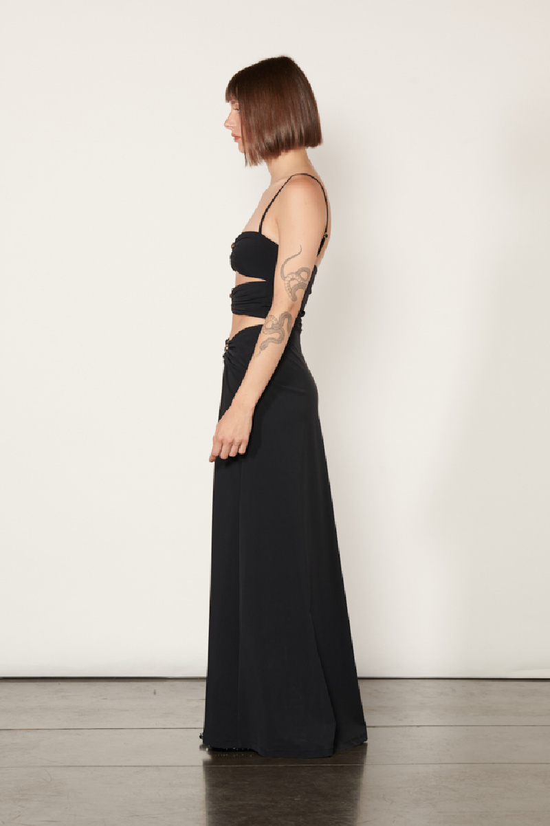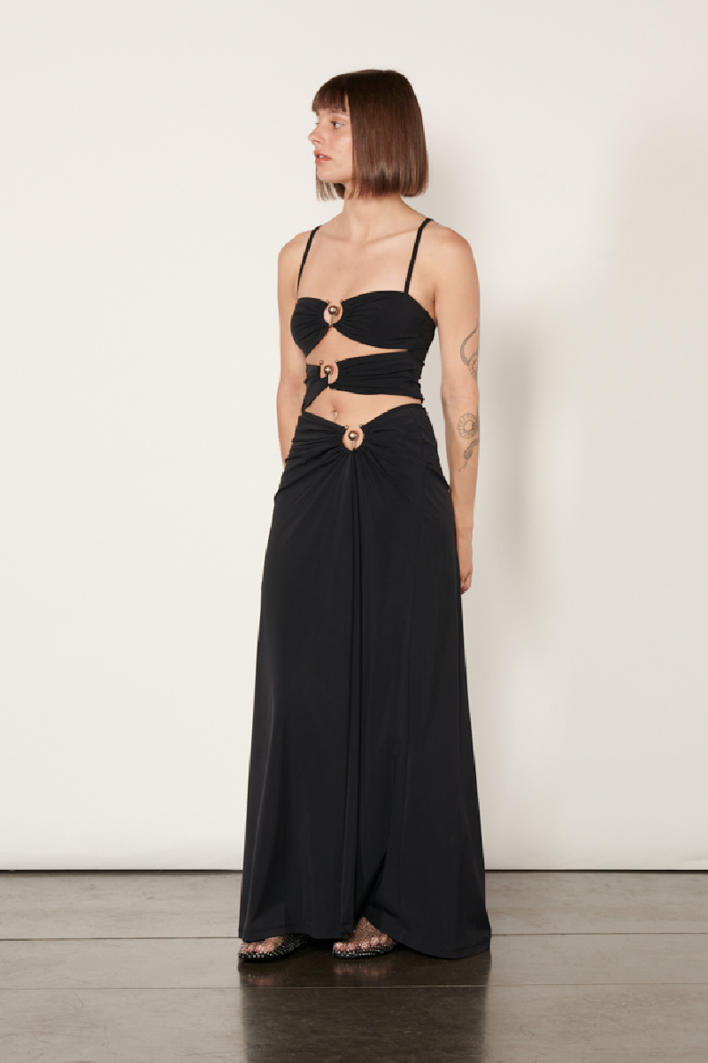 Salacia dress, masterful minimalism meets sculptural sensuality in this flowing, flared maxi dress in black by Christopher Esber.