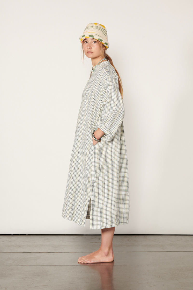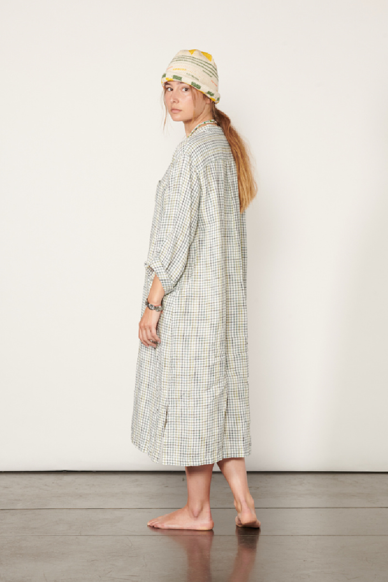 White and green checkered cotton flannel wide-neck Caftan shirt-style dress by TS.