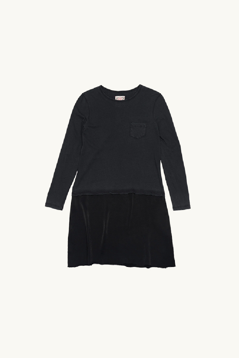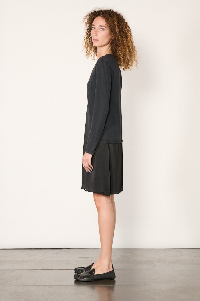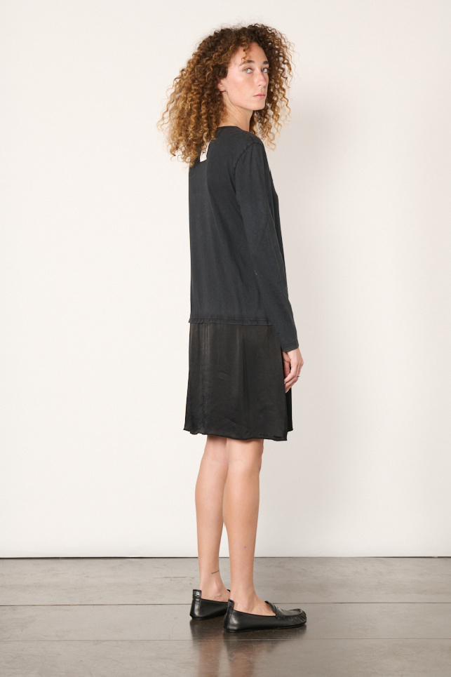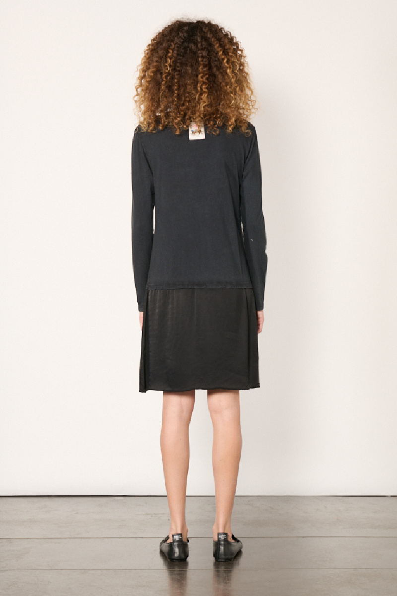 Made of jersey at the top, with a chest pocket and a contrasting satin skirt. It features distressed details at the hem and a woven label on the back.