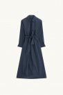 It features a long A-line silhouette, gently fitted at the waist with a matching ribbon belt that can be tied in a generous bow to add volume. Discreet side pockets and a button placket that stops at the waist complete the details.