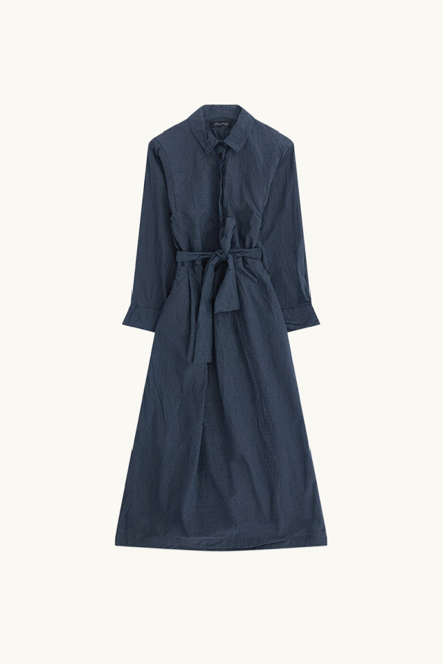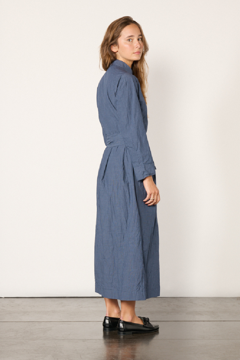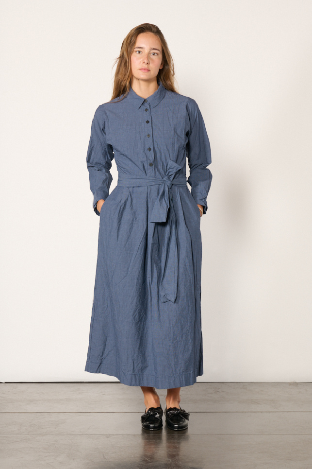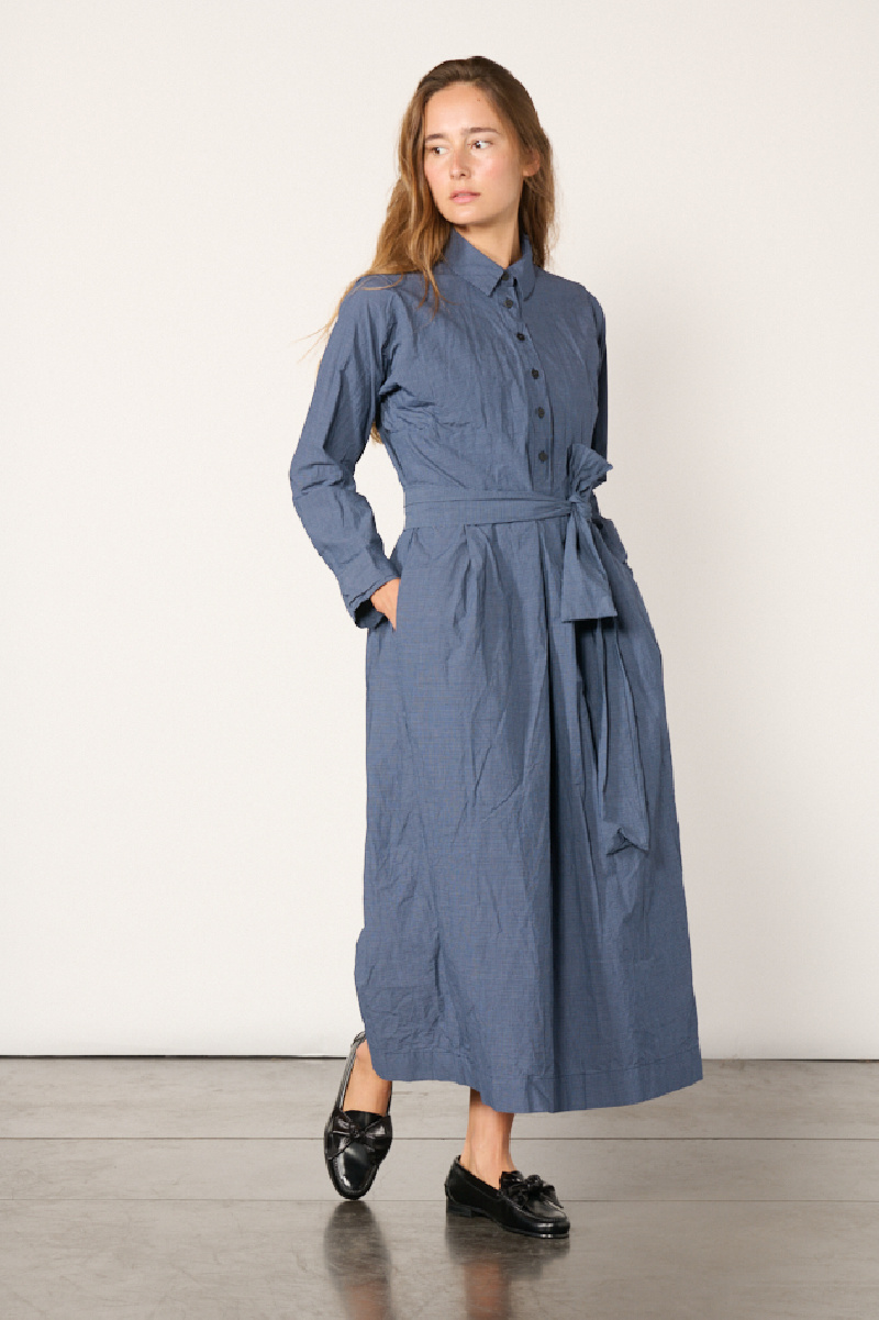 Crinkled blue cotton dress with micro-checks by the brand Bergfabel.