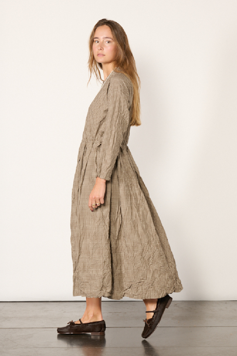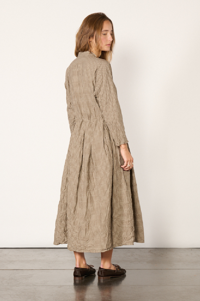Long dress made from brown cotton poplin with a small check pattern and a naturally crinkled effect, from the Pas de Calais brand.