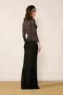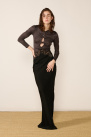It features a close-fitting cut that flows smoothly over the silhouette, a high neck, long sleeves with elasticated cuffs, and a black column skirt.